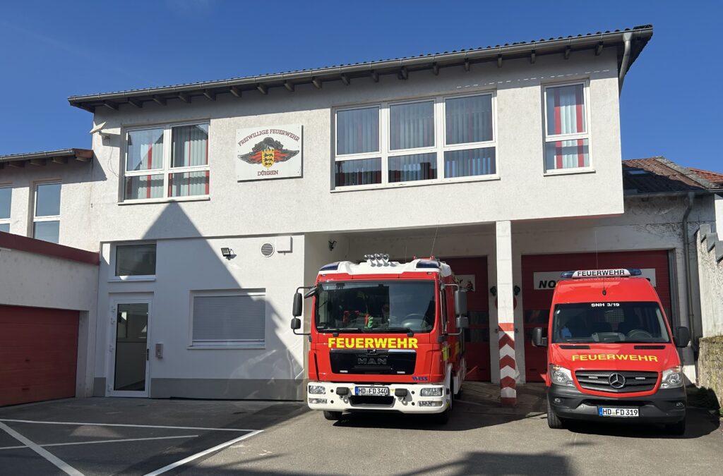 Das Gerätehaus der Feuerwehr Dühren steht in der Karlsruher Straße 54 im Hinterhof der ehemaligen Verwaltungsstelle. Die Ein- bzw. Ausfahrt erfolgt direkt auf die stark befahrene Bundesstraße 39/292. Der Abteilung Dühren stehen 2 Fahrzeugstellplätze für die Einsatzfahrzeuge zur Verfügung; im Jahr 1994 wurde das Gebäude aufgestockt und der alte und viel zu kleine Schulungsraum, der sich bis dato im Keller der Grundschule befand, konnte im Sommer/Herbst 1995 bezogen werde. Bei einem weiteren Umbau im Jahr 2025, wurde die Umkleide der Einsatzkräfte und der Jugendfeuerwehr in die angrenzende und leerstehende Halle umgezogen, sowie ein Funkraum / Büro errichtet. Weiter befinden sich im Obergeschoss eine Küche und WC´s mit Duschen.